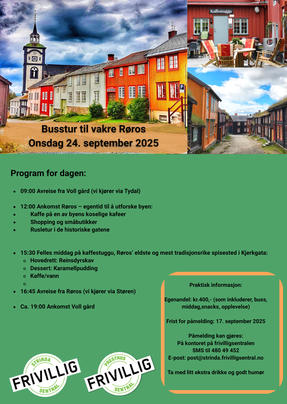 Presthus og Strinda frivilligsentraler ønsker deg velkommen til en hyggelig dagstur fra Trondheim til vakre Røros – med flott reise over fjellet, god mat og trivelig selskap.